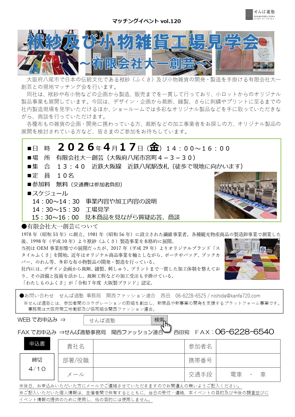 | スケジュール | 14:00~14:30 事業内容や加工内容の説明 14:30~15:30 工場見学 15:30~16:00 見本商品を見ながら質疑応答、商談 |